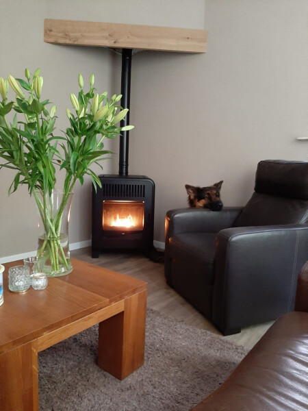 Hartelijk dank voor het goede advies m.b.t. de keuze van de kachel. We zijn er erg blij mee inclusief de hond zoals te zien op de foto.
